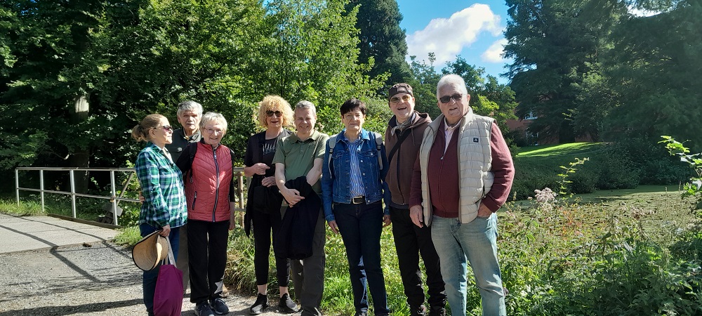 Auf angenehmen Wegen überquerten wir die große Kriegsgräberstätte aus dem 1. Weltkrieg, wo auch unser Gruppenfoto vor der Siegfriedstatue entstand. Nach verschiedenen Sehenswürdigkeiten, wie der Rest eines alten Wasserturms, des seit vielen Jahren stillgelegten Wasserfalls (beides soll für die IGA 2027 restauriert und wieder in Betrieb genommen werden), sowie der wild bewachsenen „blauen Grotte“ kehrten wir zum Parkplatz zurück und kehrten im denkmalgeschützten Kartoffelhaus ein, wo wir bei Speis und Trank den schönen Nachmittag ausklingen ließen.
